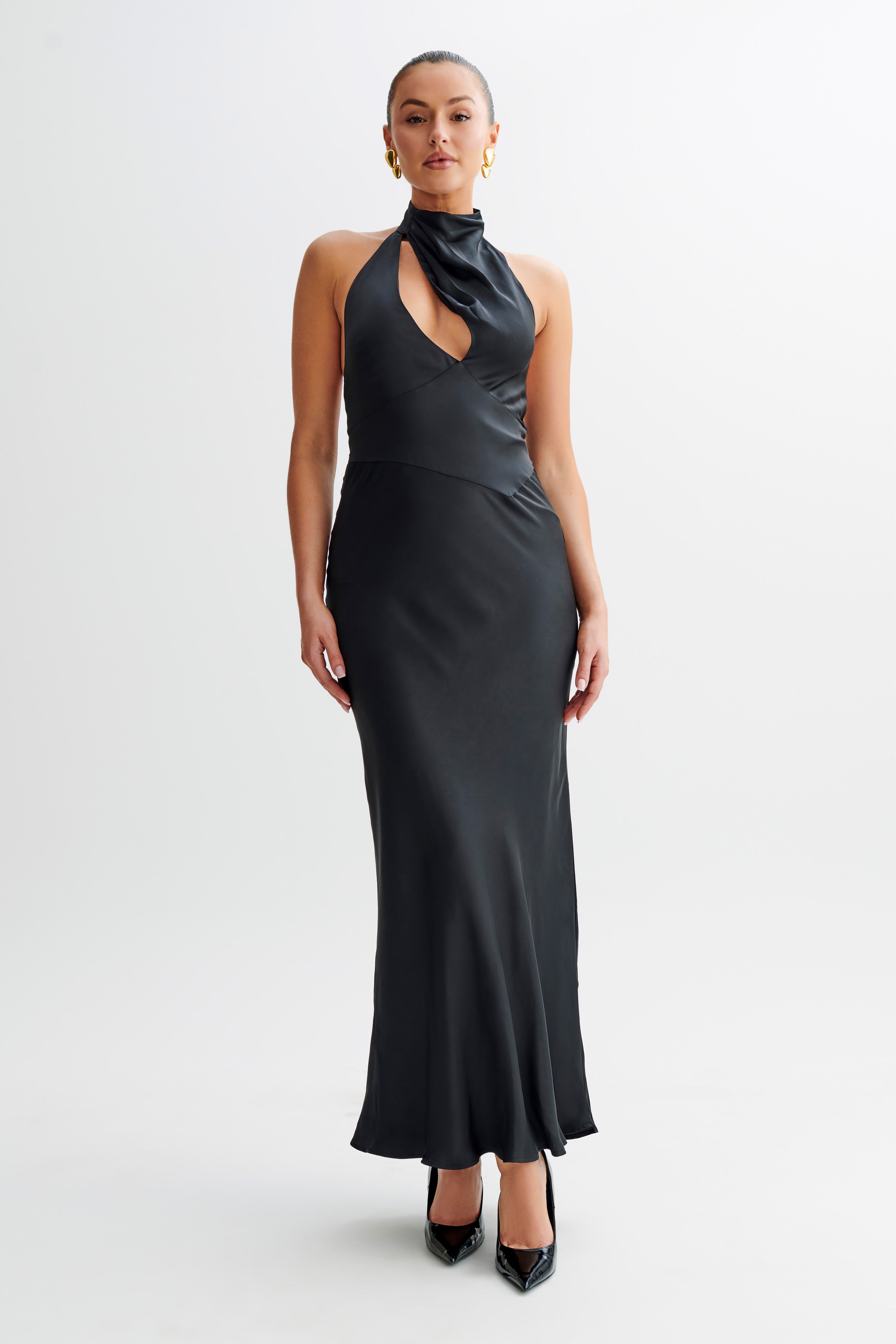 The BELLADONNA Satin Halter Maxi Dress is an exquisite choice for elegant evenings and special occasions. This dress features a chic halter neckline with a front bust cutout that adds a touch of allure. The straight skirt flows gracefully to the floor, complementing the open back design for a striking silhouette. Fully lined for comfort, the dress also includes a centre back invisible zip for a seamless finish. With its sophisticated style and luxurious satin fabric, the Belladonna Maxi Dress is perfect for making a stunning impression.