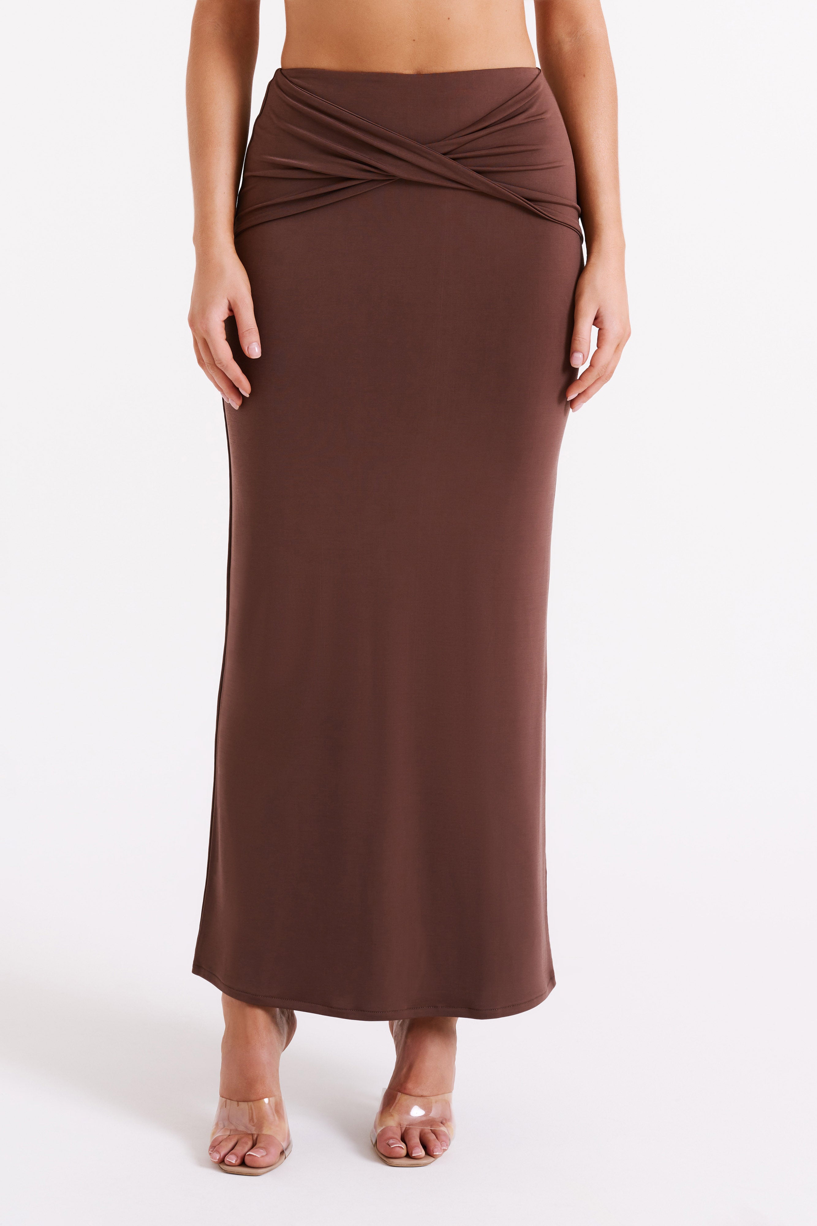 This is a soft stretch maxi skirt with a curve-loving twisted front paneling. It has been fully-lined and made for a zipper-free fit for comfortable smooth wear. Think of it as an updated take on the classic maxi skirt. Match this with ourCeri Off Shoulder Long Sleeve Topto complete the look.