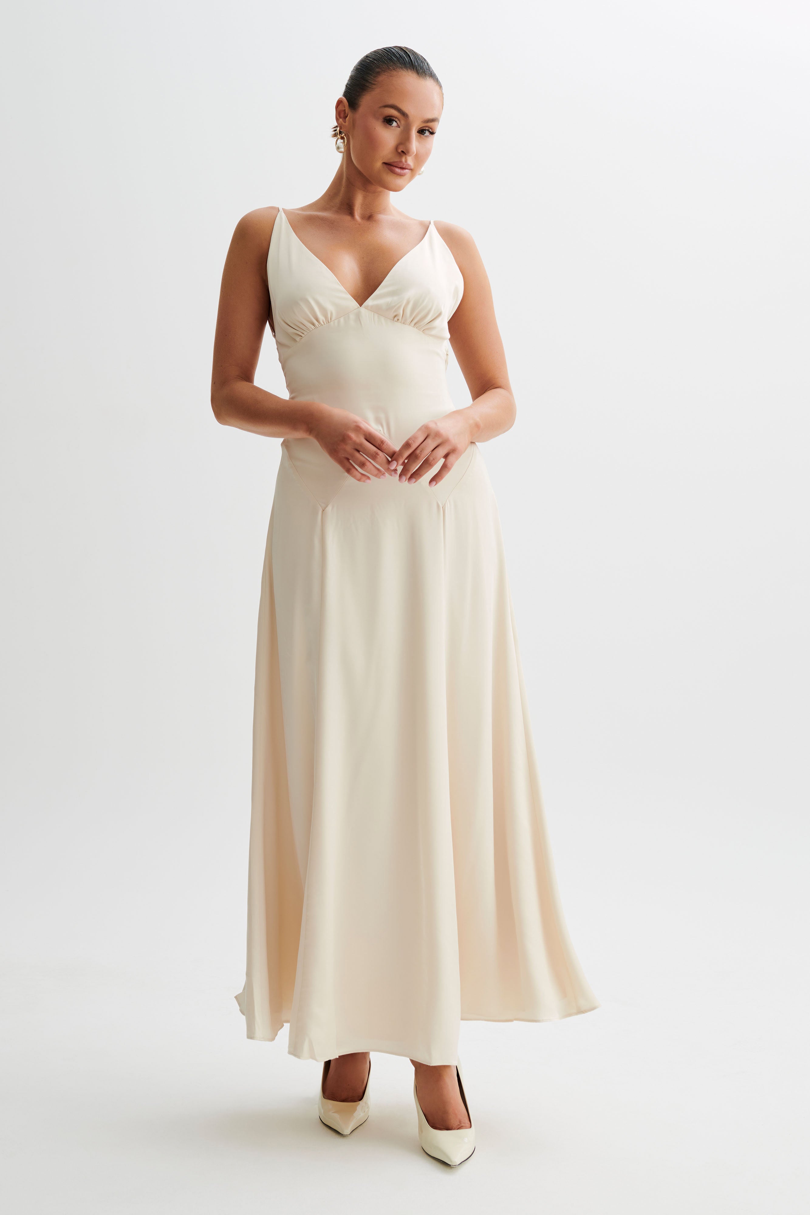 This is a sleeveless maxi dress with an open back and thin shoulder straps. Its plunging V-shaped neckline paired with the soft satin fabrication and visible underbust seams gives it an elegant vintage vibe that’s as enchanting as it is timeless. Clean front and back seam lines act as subtle accents for the fitted bodice and full-length skirt, further amplifying the dress’s tasteful, classic appeal. Pair with a clean makeup look and elegant shoes like FleurThin Strap High Heels.