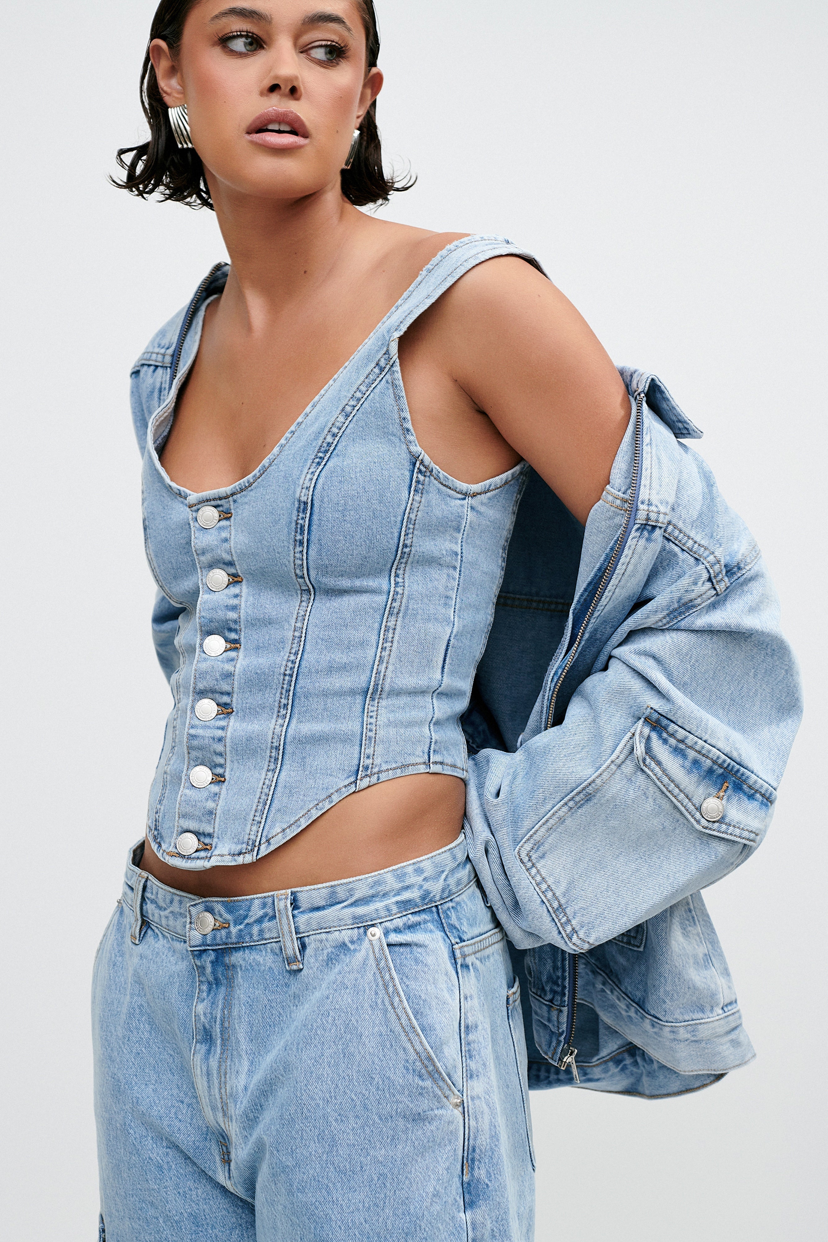 Alluring with a modern edge, LEILANI works to contour your curves and enhance your best assets. Crafted from a soft denim fabrication with slight stretch, it features a v neckline, centre front metal buttons and a dipped hemline to flatter your waistline. Opt for a denim double denim and style with our Jagger Relaxed Denim Jean.