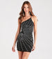 Light up the night and make a majorly glam entrance in this sparkling rhinestone mini dress! It features a sleeveless asymmetric one-shoulder neckline with dual spaghetti straps that continue to the back, a mini-length hem, a bodycon silhouette that will give off a curve-hugging fit, and iridescent rhinestone embellishments in an intricate star design that starts at the waist and cascades out. The sheer mesh fabric includes a full-length knit lining. Complete your homecoming look with metallic heels!