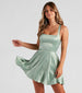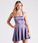 For fashionistas looking to make a memorizing entrance at Homecoming or the next formal affair, the Sabrina party satin dress is made for you! She features a sleeveless square neckline, sleek shoulder straps that lead to a cross-back lace-up design along her sultry open back, a fitted bodice, hidden side pockets for keeping your hands warm, and a short skater skirt with a fit and flare silhouette. Complete your dressy look with a beaded clutch and heels.